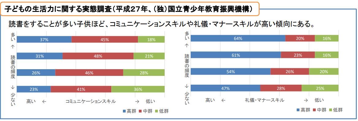 子どもの生活力に関する実態調査では、 読書をすることが多い子どもはコミュニケーションスキルや礼儀・マナースキルが高い傾向にあります。